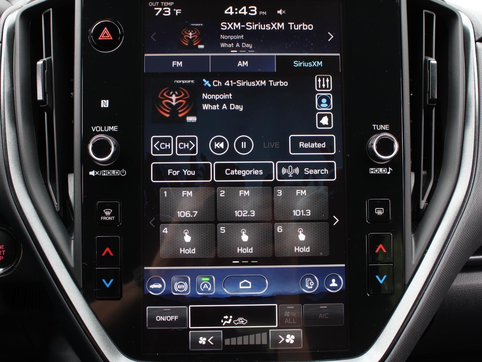 - Radio: Subaru 11.6" Multimedia Plus System -inc: valet mode, AM/FM stereo, HD Radio, multi-touch gesture high resolution display screen, voice activated controls, Bluetooth® audio streaming and hands-free phone connectivity, Bluetooth® hands-free SMS text messaging connectivity, iPod control capability, SiriusXM w/360L (4 months free trial/subscription required after), SiriusXM Travel Link (4 months free trial/subscription required after), smartphone integration: Android Auto w/full screen view and wireless connection, Apple CarPlay w/full screen view and wireless connection, USB and Over The Air (OTA) audio system update, audio system and Buletooth steering wheel control switches, 6 speakers, illuminated 3.5mm auxiliary input jack, illuminated USB A and C input charge ports, roof mounted black antenna and satellite connected services