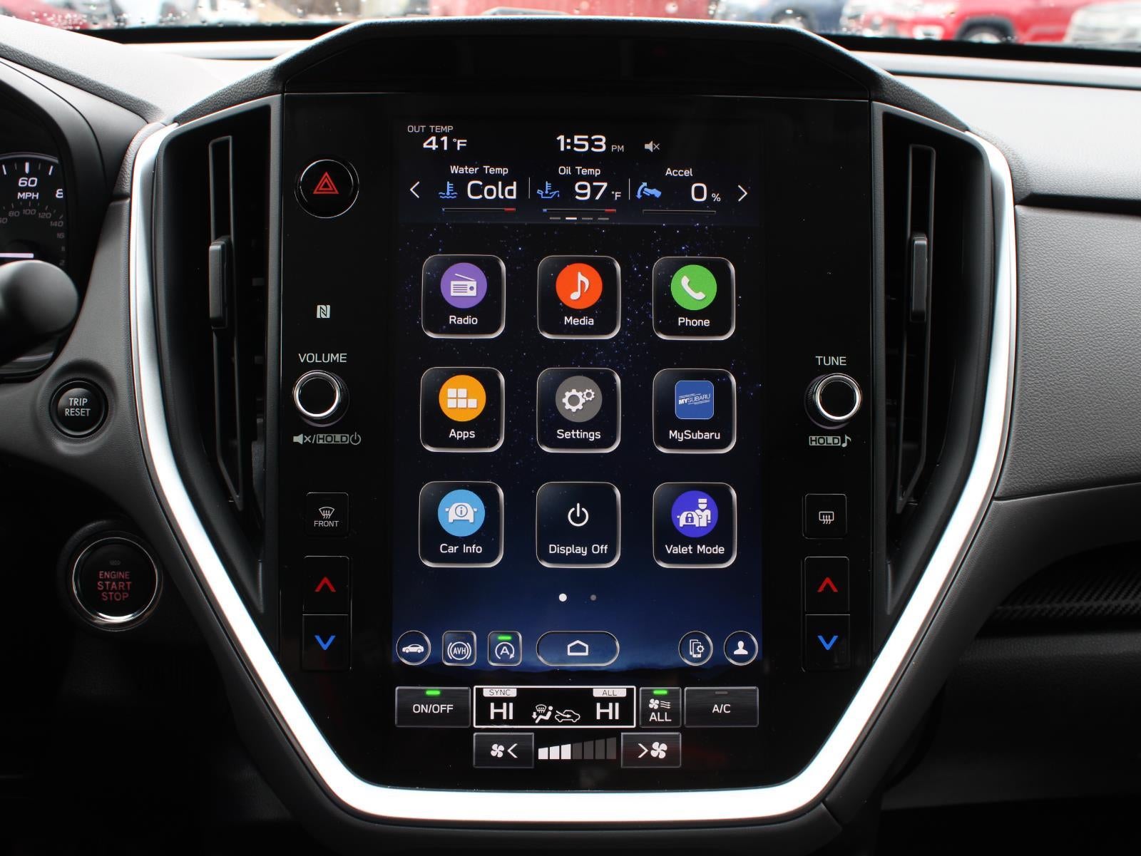 • Radio: Subaru STARLINK 11.6" Multimedia Plus Sys -inc: AM/FM stereo, HD Radio, multi-touch gesture high resolution display screen, voice activated controls, Bluetooth® audio streaming and hands-free phone connectivity, Bluetooth® hands-free SMS text messaging connectivity, iPod control capability, SiriusXM All Access Radio (4 months free trial included/subscription required after), SiriusXM Travel Link (4 months free trial included/subscription required after), smartphone integration: Android Auto and Apple CarPlay w/full screen view and wireless connection, USB and Over The Air (OTA) audio system update, steering wheel audio system and Bluetooth® control switches, 6 speakers (2 dash panel tweeter, 2 front door and 2 rear door), illuminated 3.5mm auxiliary input jack, illuminated front USB A and C input/charge ports and illuminated rear USB A and C charge ports